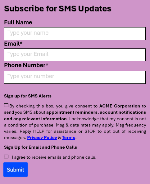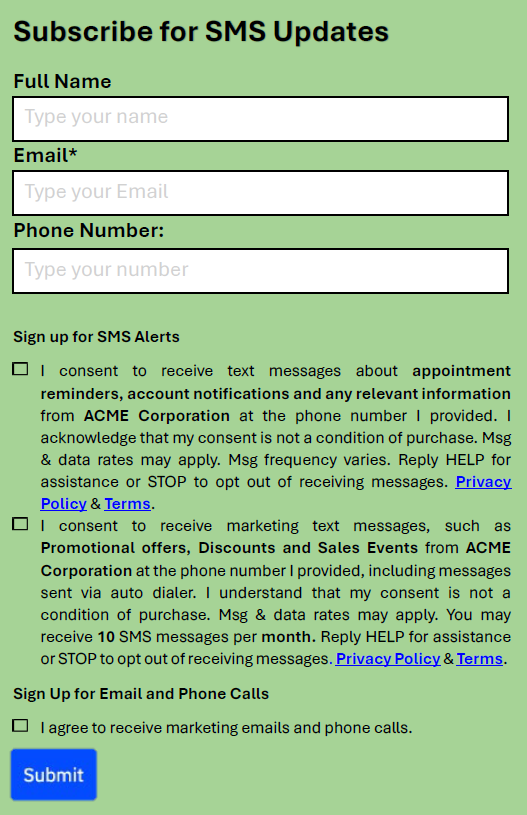 A2P/10DLC - Website Contact Form - SMS Disclosure Samples